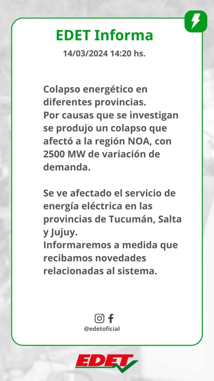 Además, se reportó un apagón en las provincias de Tucumán, Salta y Jujuy debido a las altas temperaturas en la región del noroeste argentino. Según EDET, este colapso energético se debió a una variación de demanda de 1.500 MW, afectando el suministro de energía eléctrica en las tres provincias mencionadas.