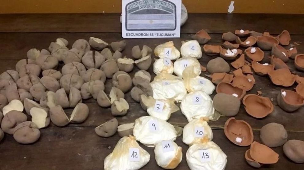 Los métodos para trasladar las drogas se han vuelto ingeniosos y también insólitos. Este Domingo en Tucumán detuvieron a un hombre que llevaba 1,6 kilos de cocaína ocultos adentro de papas de cerámica, disimuladas entre papas reales.