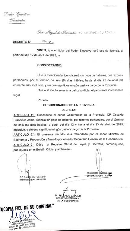 El gobernador de Tucumán, Osvaldo Jaldo, se tomó una licencia por razones personales desde el 12 al 23 de abril. La medida fue dispuesta mediante un decreto conocido la semana pasada y establece que no cobrará su sueldo durante esos días, por lo que no generará gastos para la provincia.