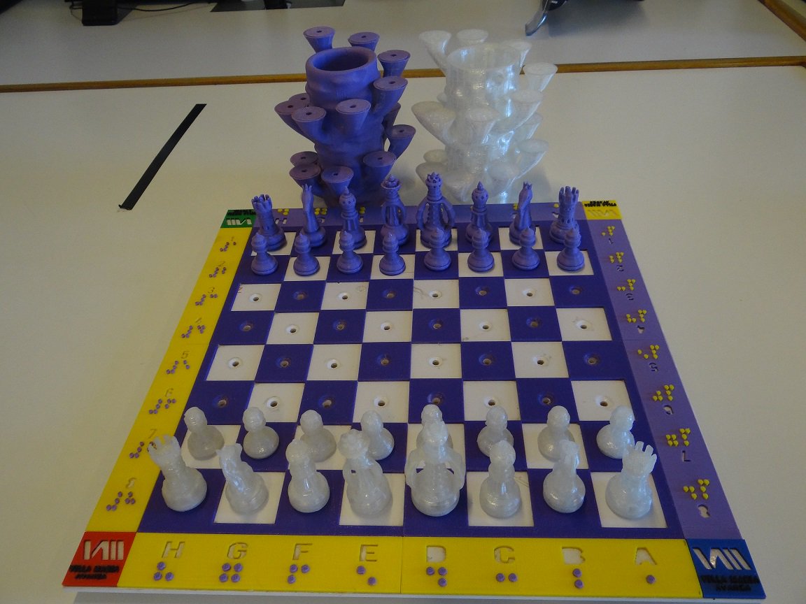 El diseño de las piezas las buscaron en plataformas web, donde se suben archivos con licencias libres, y luego las adaptaron para lograr el modelo que querían: “a las piezas oscuras las editamos y les dimos terminación puntiaguda, a diferencia de la terminación roma de las piezas blancas, para que las personas no videntes puedan diferenciarlas“, según contó el coordinador. Por otro lado, imprimieron los ornamentos para ordenar las piezas y les dieron un aspecto de castillo medieval, que sirve como ordenador. Así las piezas y el tablero quedaron en blanco y violeta, mientras que las referencias quedaron en amarillo y violeta.