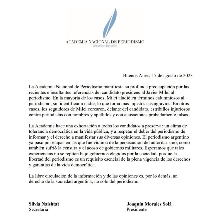 Además, el comunicado recuerda que en la historia del periodismo argentino ha habido momentos en los que fue perseguido por gobiernos autoritarios y sufrió censura durante regímenes militares. La academia expresó su esperanza de que esas experiencias no se repitan durante períodos democráticos, ya que consideran que la libertad de prensa es esencial para el funcionamiento de una sociedad democrática y el respeto de los derechos y garantías.