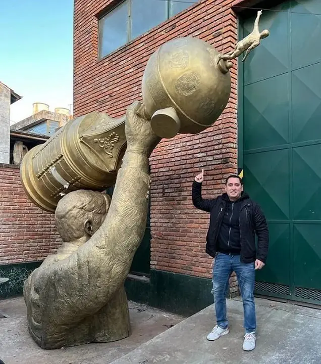 La estatua de bronce fue inspirada en una imágen del fotógrafo de Clarín, Marcelo Carroll que le sacó a Gallardo con la Libertadores en sus manos, en el campo de juego del Santiago Bernabéu.