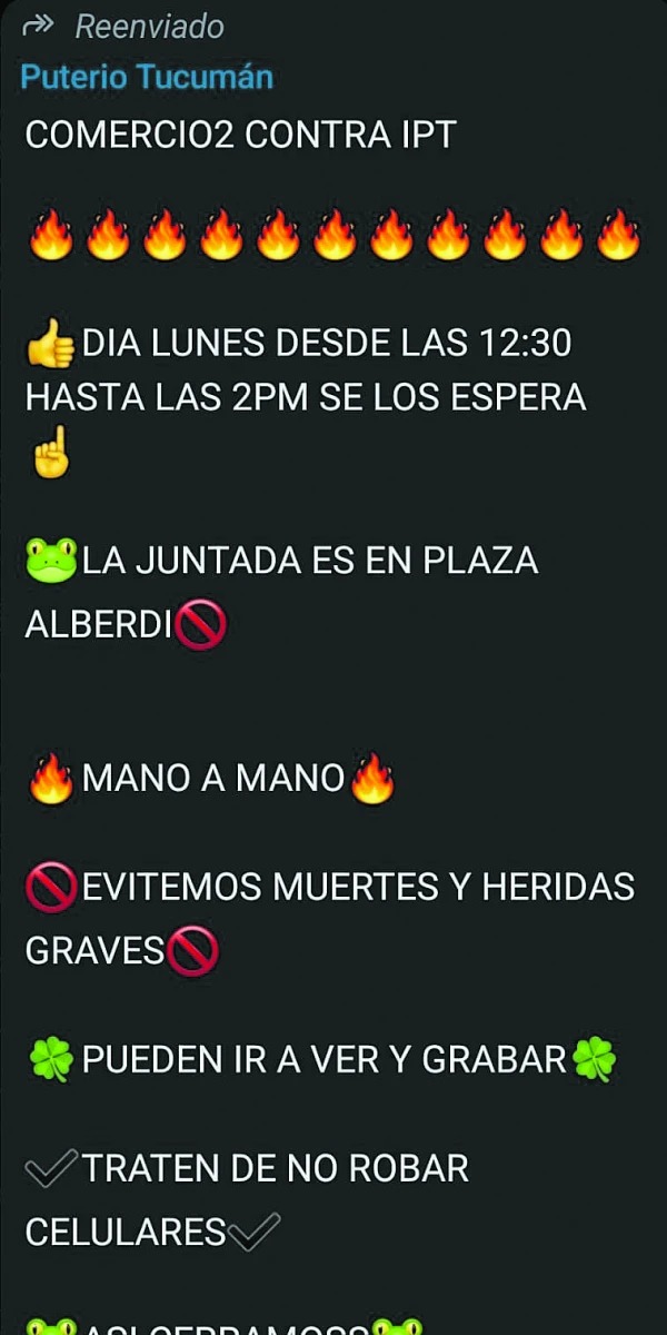 Una convocatoria para un enfrentamiento entre estudiantes de escuelas secundarias del microcentro tucumano en la plaza Alberdi no se materializó, a pesar de la difusión del mensaje durante el fin de semana. El llamado a la confrontación entre el Instituto Privado de Tucumán y la escuela Comercio Nº 2 fracasó, y la plaza Alberdi estuvo prácticamente desierta durante la jornada.