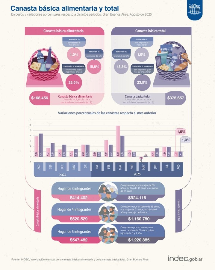 El Instituto Nacional de Estadística y Censos (Indec) informó este miércoles que la inflación en Argentina fue del 1,9% en agosto de 2025, el mismo nivel que en julio, y que en los últimos doce meses acumula un 33,6%. En lo que va del año, los precios subieron un 19,5%. Según el organismo, pese a las turbulencias del último mes y medio vinculadas al escenario electoral y a la suba del dólar, el impacto en los precios fue bajo debido a la caída del consumo, que limita el traslado de mayores costos a las góndolas.