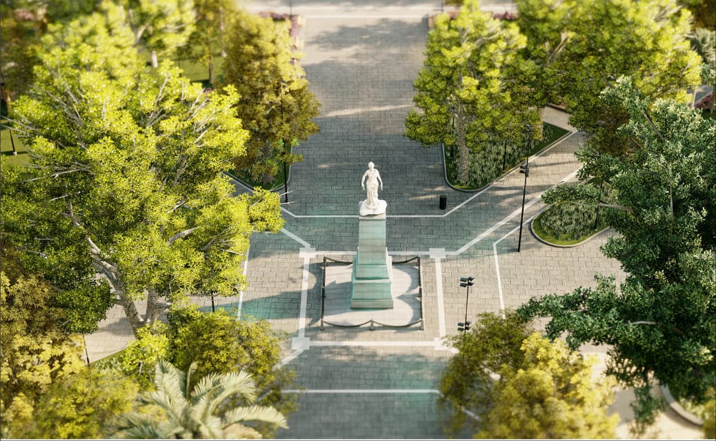 Las caminerías serán alumbradas con farolas ornamentales y habrá artefactos instalados en distintos puntos estratégicos de la plaza para realzar el arbolado y algunos elementos particulares, como la “Estatua de la Libertad”.