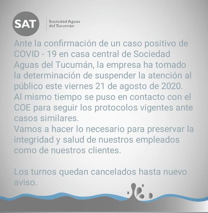 Debido a un caso positivo de coronavirus, la Sociedad Aguas de Tucumán decidió no abrir sus puertas este viernes para desinfectar sus instalaciones.