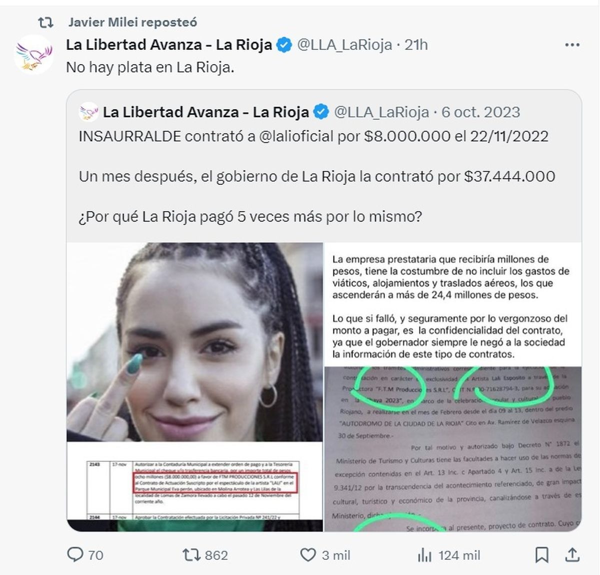La reconocida cantante y actriz Lali Espósito se encuentra en el centro de la polémica después de que trascendiera que habría cobrado una suma significativa, específicamente $37.444.000, por su participación en la Fiesta Nacional de La Chaya, un evento organizado por el gobierno de La Rioja.