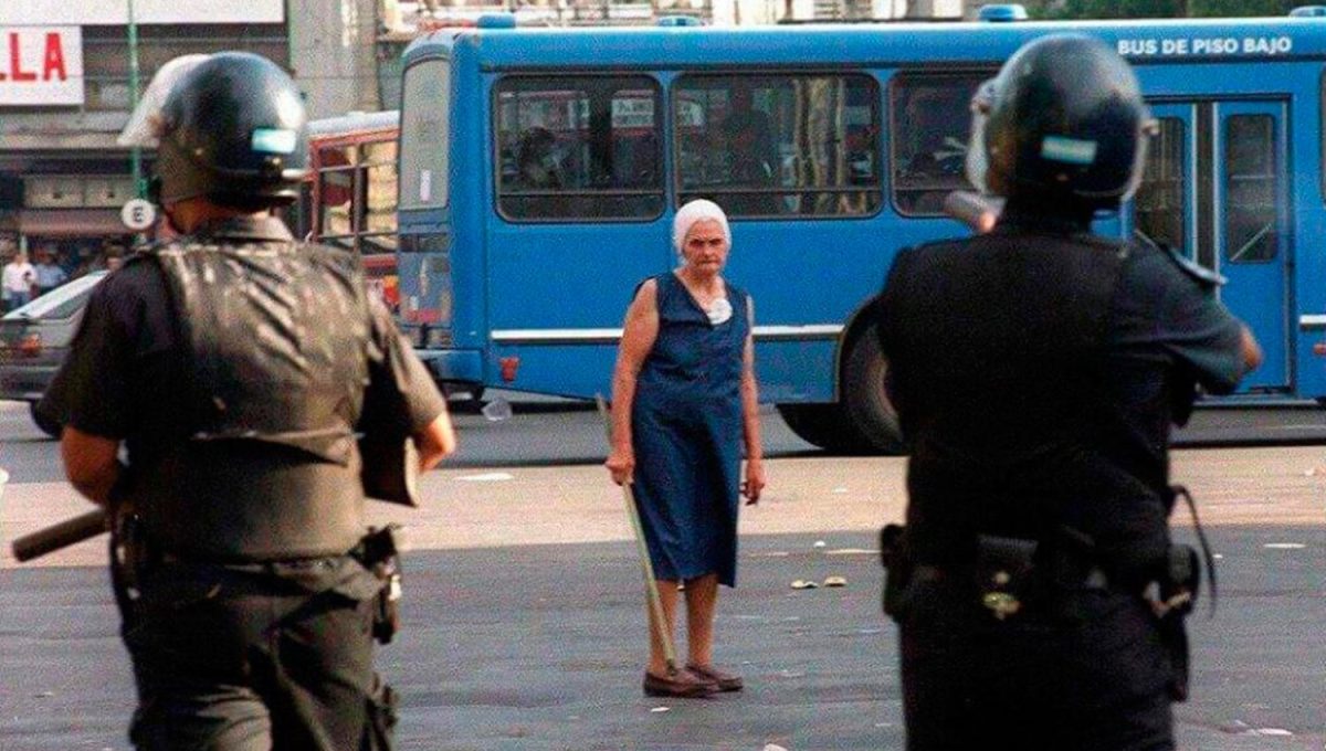 Más atrás en el tiempo, la página de Facebook “7D” publicó dos fotos sobre la represión ocurrida el jueves último que no fueron tomadas esa tarde. En la primera se puede ver a una anciana con un palo frente a dos policías armados cuando uno de ellos le apunta. Pero es una imagen de las protestas ocurridas el 19 y 20 de diciembre de 2001 y fue tomada por el equipo de fotógrafos de Télam, como se puede ver en este videosobre una exposición fotográfica de la agencia estatal.