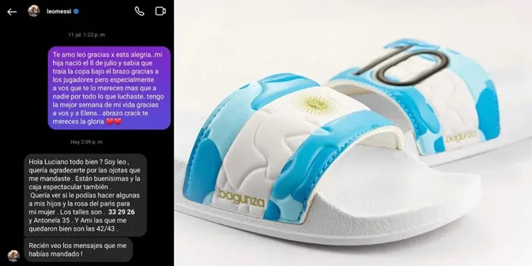 “Hola Luciano, ¿todo bien? Soy Leo”, comenzó presentándose Lionel Messi. Y continuó: “Quería agradecerte por las ojotas que me mandaste. Están buenísimas y la caja espectacular también”.