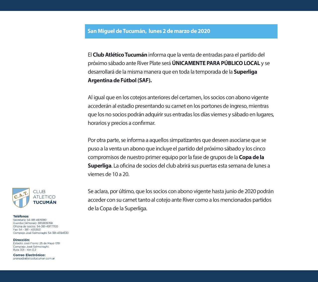Sin embargo, este lunes por la mañana, el conjunto tucumano sacó un comunicado en las redes sociales en el que informa que “la venta de entradas para el partido del próximo sábado ante River Plate será únicamente para público local y se desarrollará de la misma manera que en toda la temporada de la Superliga“.