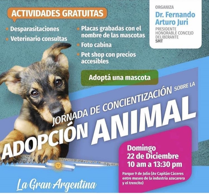 Este domingo 22 de diciembre, a partir de las 10 hasta las 13, se realizará el tercer encuentro sobre Concientización de Adopción Animal en el parque 9 de Julio, avenida Capitán Cáceres, entre el Museo de la Industria Azucarera y la Estación 9 de Julio. El encuentro también hará referencia a la campaña “Más luces y menos ruido. No a la Pirotecnia”, frente a la cercanía de las fiestas.