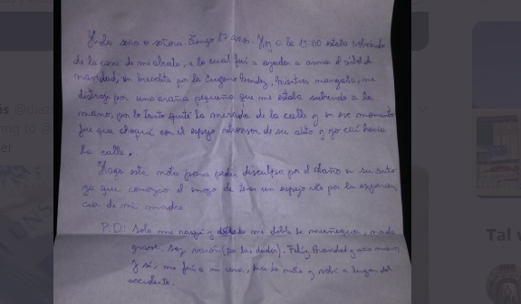 Como todos los días, la madre de Tomas Díaz, fue a trabajar a una escuela de San Cayetano. Acostumbrada a dejar el auto estacionado en la calle, la mala suerte toco su puerta. Alrededor de las 15, un joven de 17 años, iba en su bicicleta y por distracción choco contra el vehículo. Lo curioso de la historia, fue la nota que le dejo a la dueña y que luego fue posteada por las redes sociales.