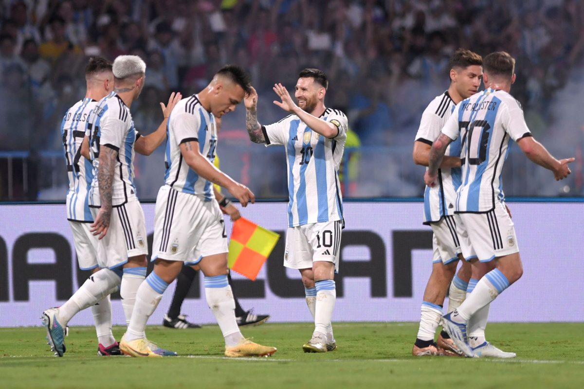 Pocas horas antes del inicio del partido se confirmó que Emiliano Martínez; Gonzalo Montiel, Germán Pezzella, Nicolás Otamendi, Marcos Acuña, Alexis Mac Allister, Enzo Fernández, Giovanni Lo Celso, Lionel Messi, Lautaro Martínez, Nicolás González era la formación para la noche.