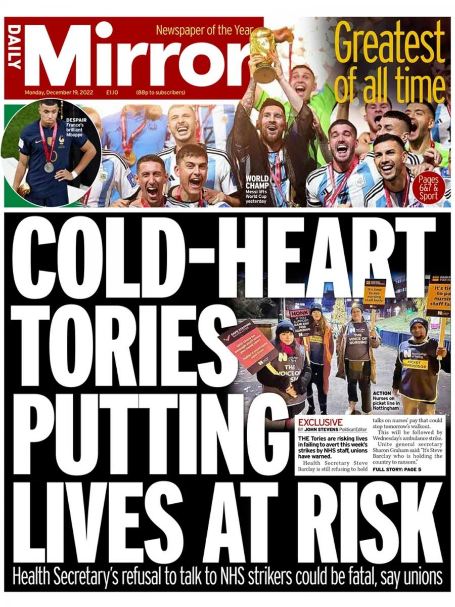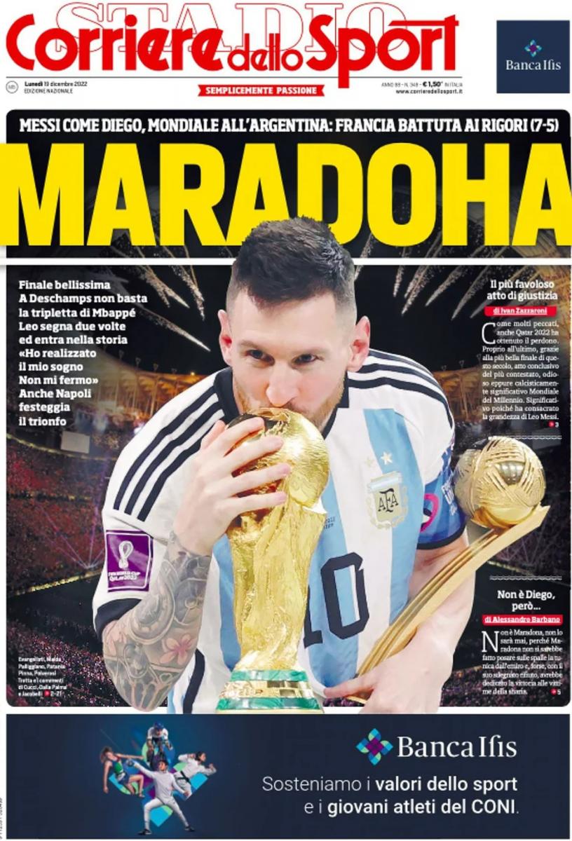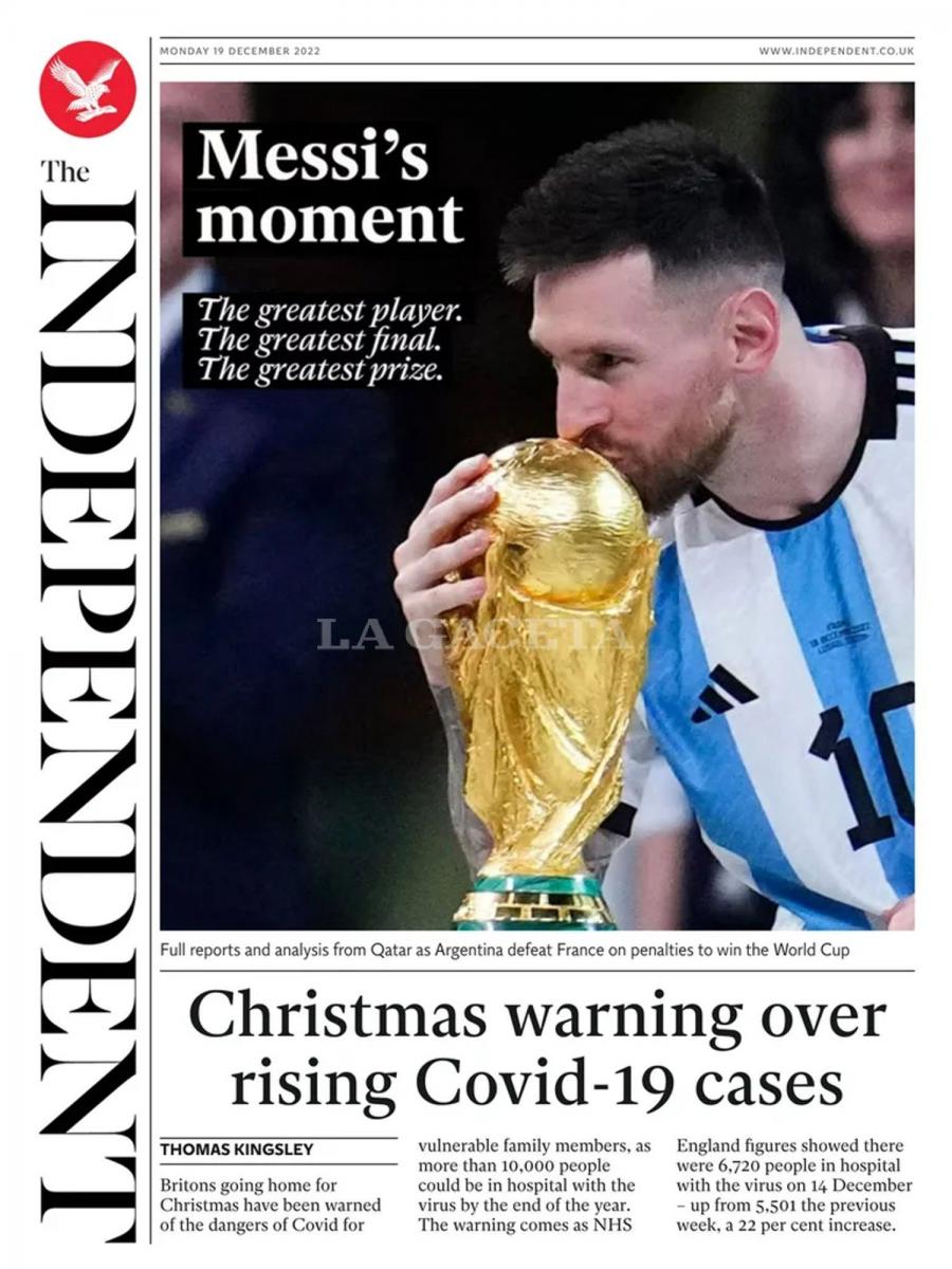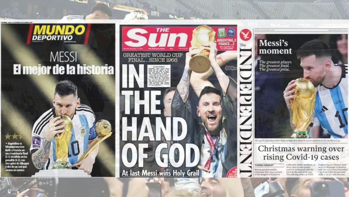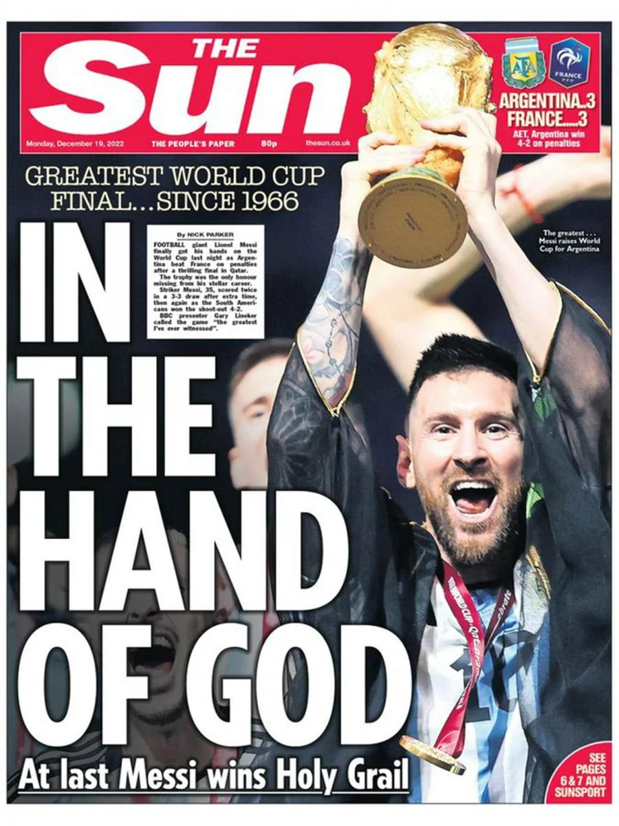 Uno de los medios británicos que le cedió su tapa a la consagración argentina fue “The Sun”, que eligió a Lionel Messi levantando la copa bajo el titular “In the hand of God” (en las manos de Dios), en un juego con la famosa frase de Diego Maradona (“la mano de Dios”).