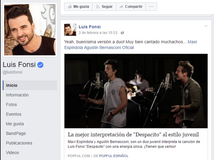 El último video que subió a su cuenta fue la canción de Luis Fonsi “Despacito”, interpretada junto al actor Agustín Bernasconi. Días después, llegó una grata sorpresa: el mismo Luis Fonsi fue el encargado de felicitar al artista tucumano por su excelente interpretación.