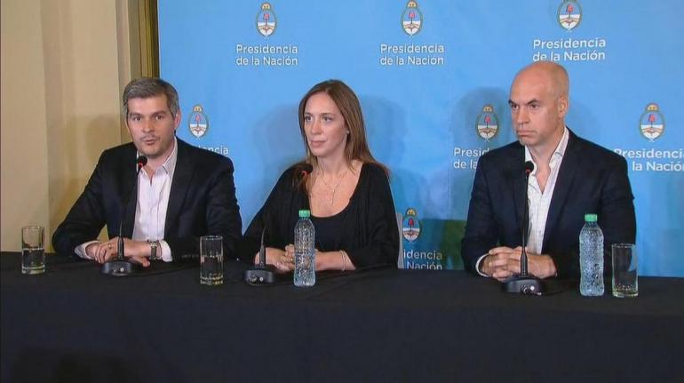 El jefe de Gabinete, Marcos Peña, la gobernadora de la provincia de Buenos Aires, María Eugenia Vidal; y el jefe de gobierno porteño, Horacio Rodríguez Larreta, brindaron una conferencia de prensa tras la reunión de Gabinete ampliado encabezada en la mañana de este jueves por el presidente Mauricio Macri.