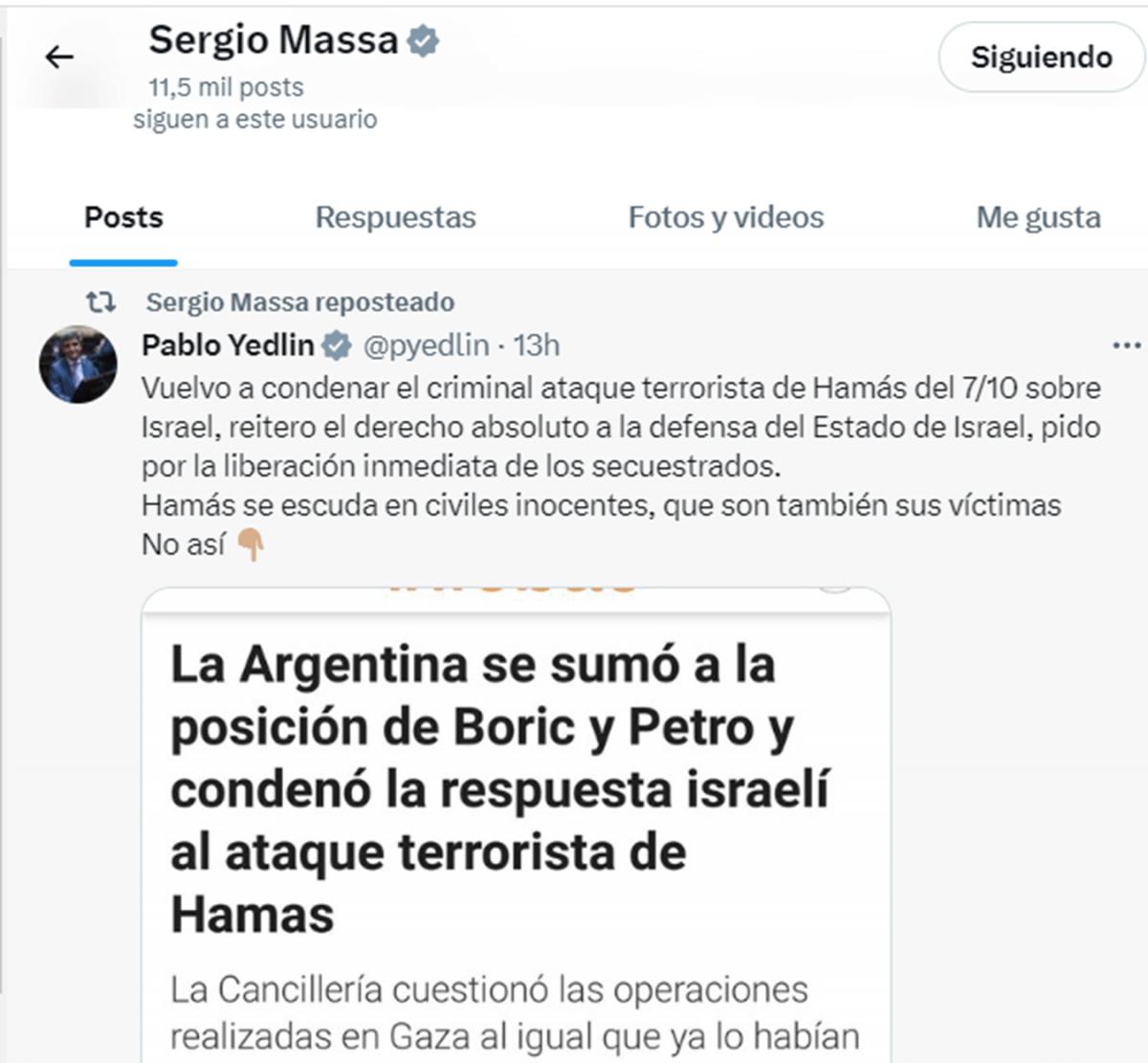 En respuesta a esta declaración, el senador Yedlin expresó su desacuerdo en las redes sociales, reafirmando su condena al ataque terrorista de Hamas y el derecho de Israel a la autodefensa, y pidió la liberación inmediata de los rehenes. Yedlin dejó claro que su posición coincide con esta postura, con un guiño a Massa, y el candidato presidencial volvió a publicar el mensaje del senador, mostrando su apoyo.