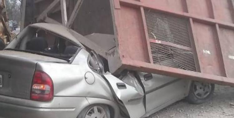 El hecho ocurrió en la ciudad de Simoca, y en la colisión, un acoplado de uno de los camiones, cayó encima del auto, donde milagrosamente nadie salió herido.
