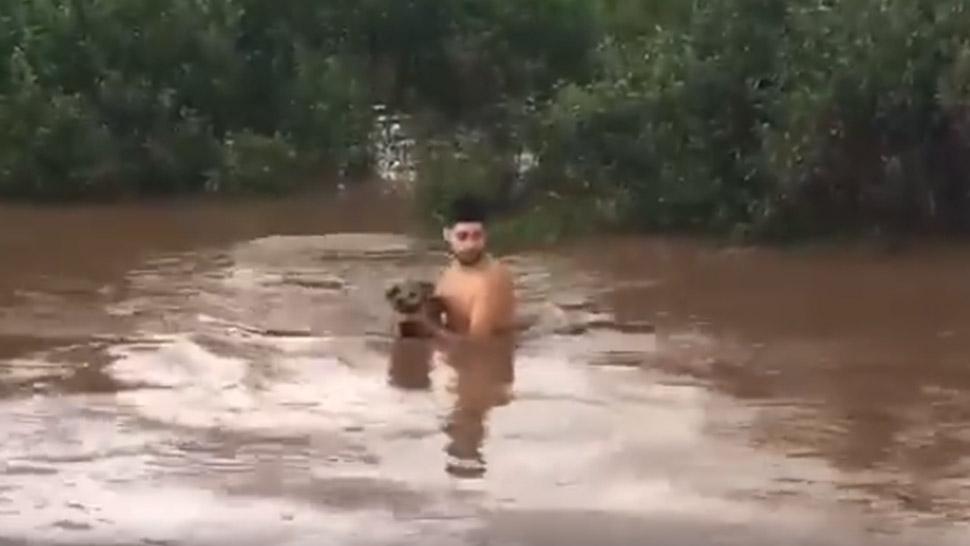 Un joven decidió lanzarse al agua para poder rescatar a un perro que, de acuerdo con el video publicado por el sitio web El Tucumano, era arrastrado por la corriente en La Madrid, la zona más castigada de toda la provincia.