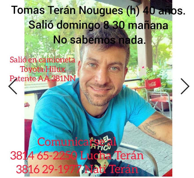 Tomás Terán Nougués (h), de 40 años de edad salió el domingo a las 8.30 de la mañana de su casa en Yerba Buena, y desde entonces no hay noticias sobre su paradero.