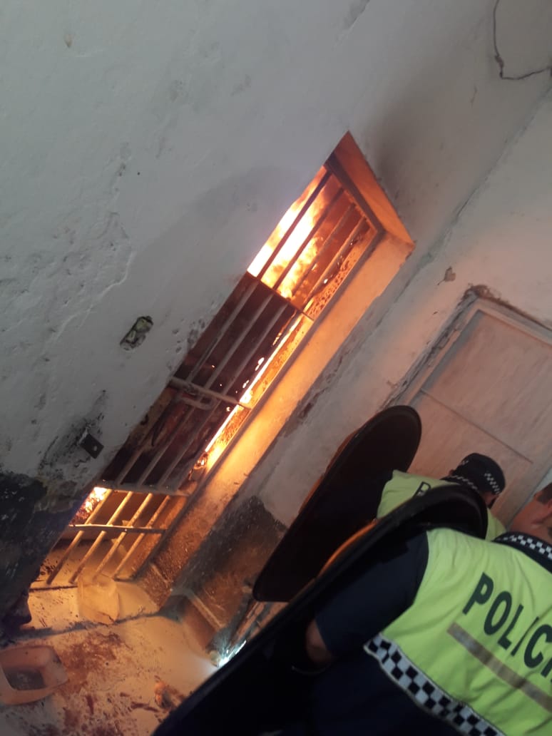 En las imágenes y videos recogidos, se advierte que los efectivos policiales tratan de controlar la situación mientras el fuego se desata en el interior y de las ventanas salen columnas de humo. El registro también muestra el fuego en una de las celdas y a los policías desconcertados por la situación.
