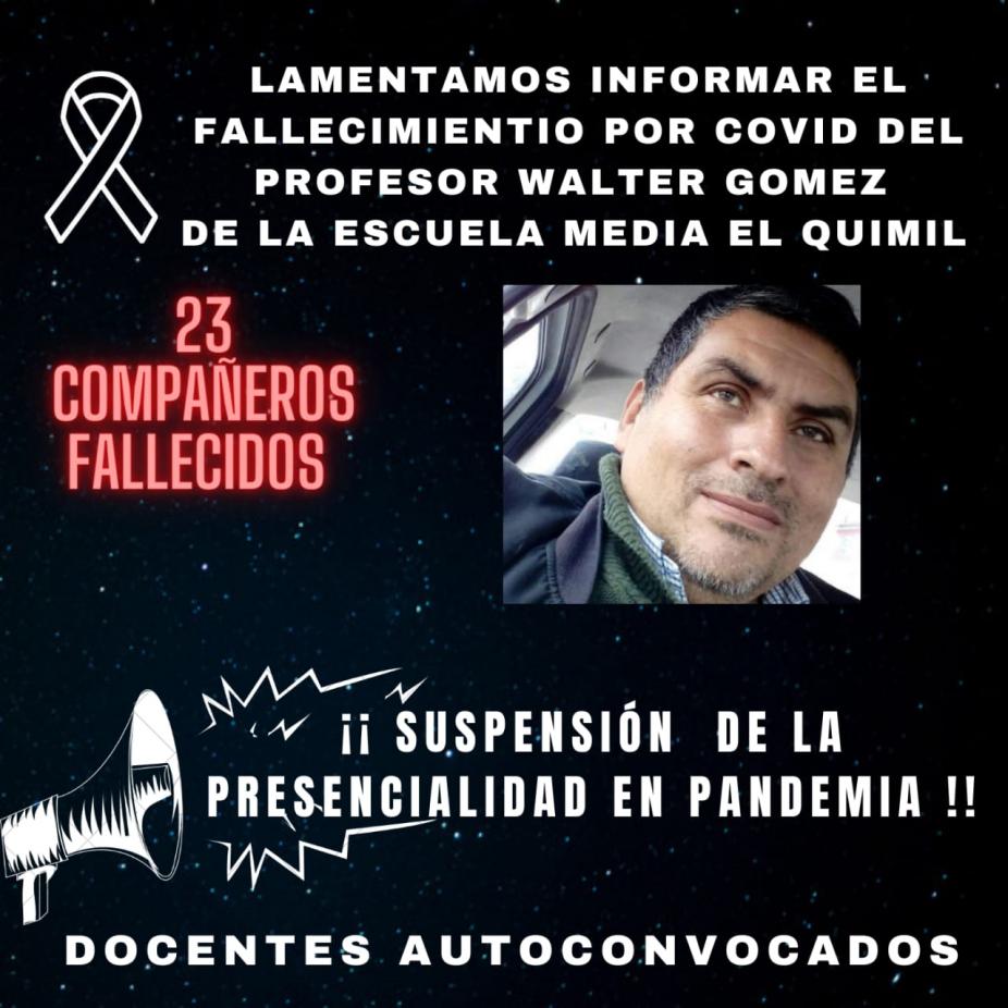 Walter Gómez, que se desempeñaba como profesor de la escuela media de El Quimil, es otra víctima fatal del virus que afecta a nivel mundial. Hasta el momento, son 23 los profesionales de la educación que fallecieron durante la pandemia.