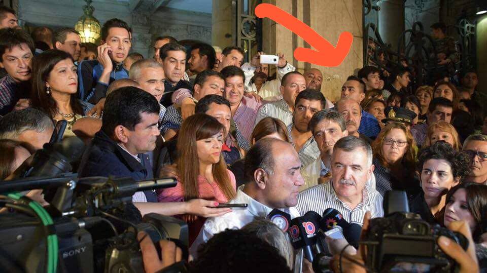 En una fotografía se puede observar a la misma persona cerca de los referentes del PJ local José Alperovich, el gobernador Juan Manzur y el vicegobernador Osvaldo Jaldo, durante el discurso electoral en la escalinata de Casa de Gobierno.