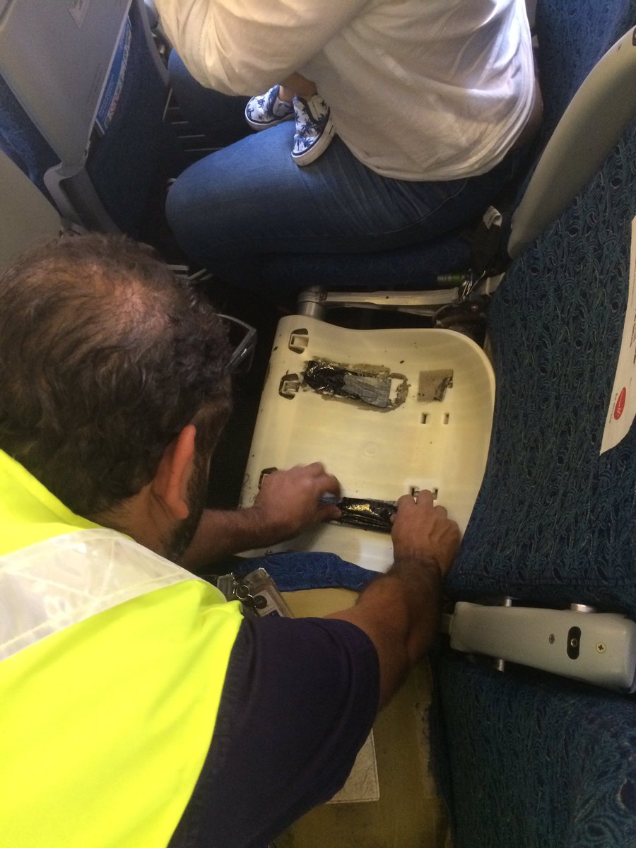 “Me ocurrió hoy, en el vuelo 1503 de Aerolíneas Argentinas que debía traerme de regreso a Buenos Aires de unas microvacaciones junto a mi mujer y mis hijos en Córdoba, para pasar el Año Nuevo en familia”, relata Marcelo Veneranda en una crónica en La Nación. El periodista publicó en las redes sociales un video y un par de fotos del “operativo de emergencia” para reparar la butaca en la que viajarían hasta Capital.