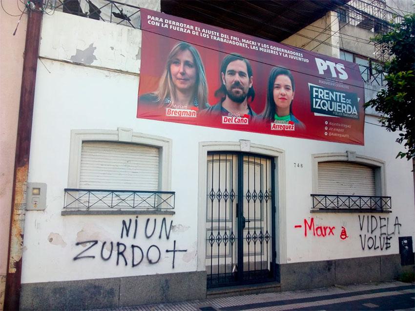 Apenas llegaron a la casa donde se asienta el partido, sus rostros quedaron demudados. Es que los testigos encontraron en la fachada del inmueble pintadas que reivindican a la dictadura militar: aparecieron en la sede del Partido de los Trabajadores Sociales-Frente de Izquierda (PTS-FIT) algo que sus militantes vincularon de inmediato con un ataque provocador e injuriantes.