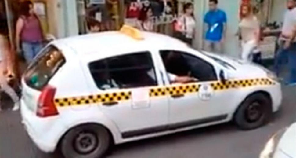 El insólito hecho fue registrado en video por la pasajera de un colectivo que circulaba por la zona céntrica y se puede ver al taxi circulando por la vereda, mientras una decena de transeúntes esquivan sorprendidos al vehículo.