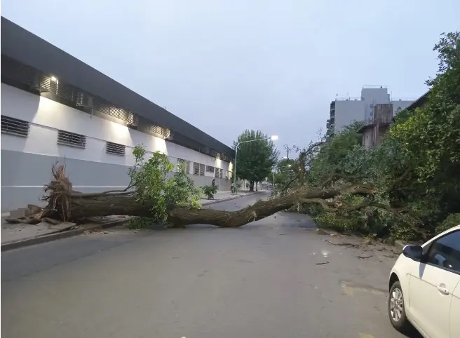 Los vecinos aguardan la presencia del personal de Espacios Verdes de la Municipalidad capitalina, que procederá a trocear y a retirar el árbol, con lo que se podrá reestablecer el tránsito de vehículos por Lamadrid, entre las calles La Rioja y Alberdi.