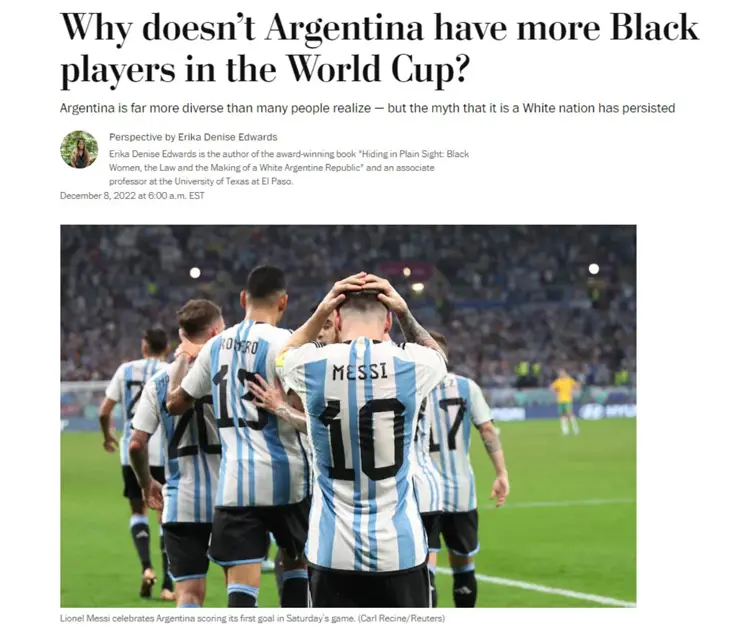 “En marcado contraste con otros países sudamericanos como Brasil, la selección argentina de fútbol palidece en términos de representación negra”, destacó a continuación para luego aclarar que no se trata de una observación actual y se remonta al año 2014 -en ese año se disputó el Mundial de Brasil-.
