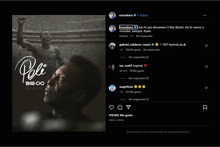 Desde la muerte de Diego, el 25 de noviembre de 2020, la cuenta de Instagram del astro argentino, con 7,6 millones de seguidores, quedó a cargo de sus hijos, quienes la utilizan para expresarse frente a hechos trascendentales y también para recordar acontecimientos de su carrera deportiva. Maradona y Pelé, las dos máximas figuras del fútbol mundial en el siglo XX, mantuvieron una relación con vaivenes marcada con la mutua admiración, los egos y sus diferentes posiciones políticas en relación con la FIFA.