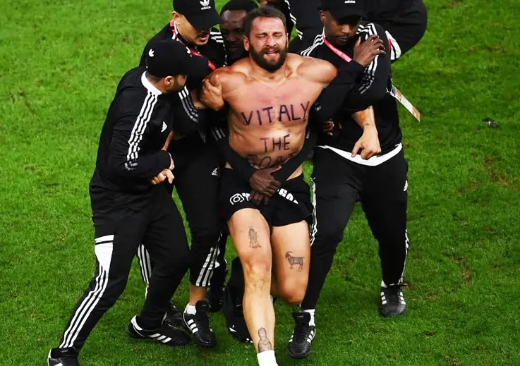 Vitaly, de 30 años, tiene un historial de invasión de canchas. Hizo el mismo chiste en la final de la Copa del Mundo de 2014 en Brasil. Esa vez tenía “bromista nato” estampado en su cuerpo. No le trae mucha suerte a la Selección. Por suerte había otro gigante en cancha esta vez. Emiliano Dibu Martínez.