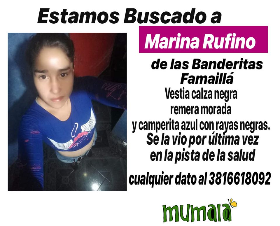 “La familia pide colaboración a la sociedad tucumana para dar con su paradero. Marina vestía una calza negra, remera morada y campera azul con rayas negras. Para brindar información comunicarse al teléfono 3816618092.”