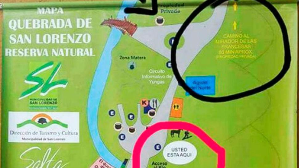 Un cartel turístico realizado por la Municipalidad de San Lorenzo, en Salta, generó críticas y abrió una fuerte polémica. El escándalo surge de que el mapa que describe los principales atractivos de la Quebrada de San Lorenzo indica también el lugar en donde aparecieron muertas las turistas francesas, Cassandre Bouvier y Houria Moumni.