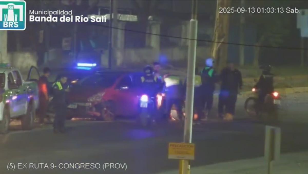 A las 0.58, una cámara ubicada en ruta 306 y ex ruta 9 registró a un Peugeot 208 color bordó escapando a toda velocidad de un semáforo, perseguido por una camioneta Fiat Strada blanca de la Policía. En las imágenes se ve cómo un uniformado intentó interceptar al vehículo, que siguió hacia Banda del Río Salí, mientras se daba aviso a los vigías de la zona.