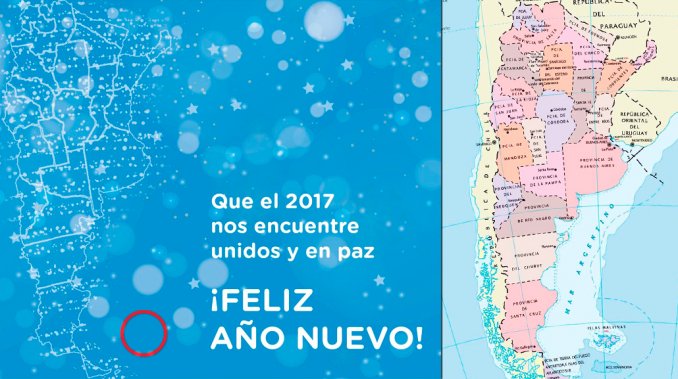 “Que el 2017 nos encuentre unidos y en paz ¡FELIZ AÑO NUEVO!”, dice el tuit publicado en la cuenta del ministerio de Desarrollo Social, que va acompañado de una foto en la que no aparecen las Malvinas ni el sector de la Antártida sobre el que la Argentina reclama soberanía.