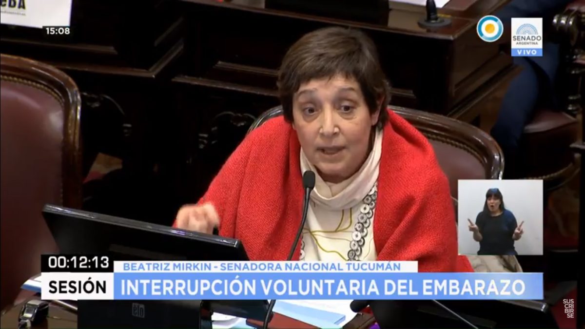 La senadora Beatriz Mirkin se convirtió en tendencia en las redes sociales con su efusiva exposición a favor de la legalización del aborto. “A mí me votaron para legislar y la ley no es pétrea, la ley se puede cambiar, se puede mejorar y mejorarle así las condiciones de vida a las ciudadanas”, apuntó. “En Argentina, se aborta. Se aborta de manera clandestina y se aborta en los sanatorios.”
