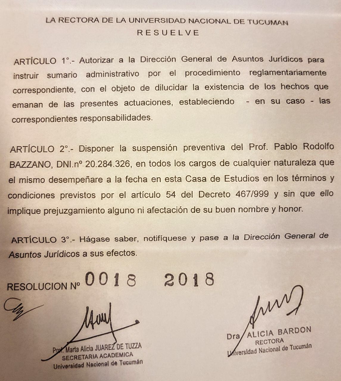 Un docente del colegio Gymnasium de la Universidad Nacional de Tucumán, recibió una suspensión preventiva por tiempo indeterminado, luego de ser sindicado por un caso de abuso sexual perpetrado en el marco de sus actividades en ese establecimiento educativo. El anuncio de la UNT recae sobre Pablo Rodolfo Bazzano, a través de una resolución número 0018 2018 que lleva la firma de la rectora Alicia Bardón y Marta Alicia Juárez de Tuzza, en su carácter de secretaria académica.