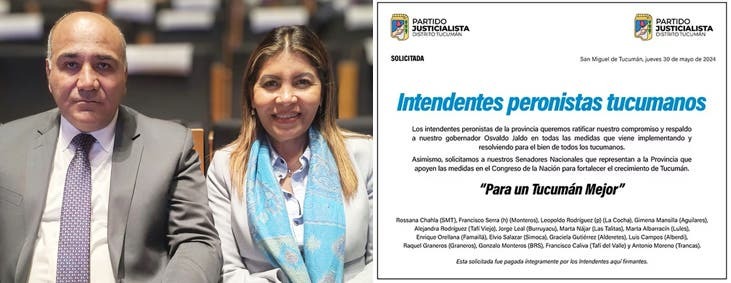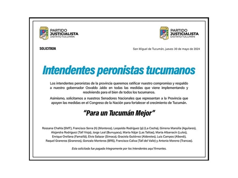 Bajo el título “Para un Tucumán Mejor”, la solicitada fue firmada por la intendenta de San Miguel de Tucumán, Rossana Chahla, y otros 15 intendentes de distintos municipios de la provincia, entre ellos Francisco Serra (Monteros), Leopoldo Rodríguez (La Cocha), Gimena Mansilla (Aguilares), Alejandra Rodríguez (Tafí Viejo), Jorge Leal (Burruyacu), Marta Nájar (Las Talitas) y Marta Albarracín (Lules).