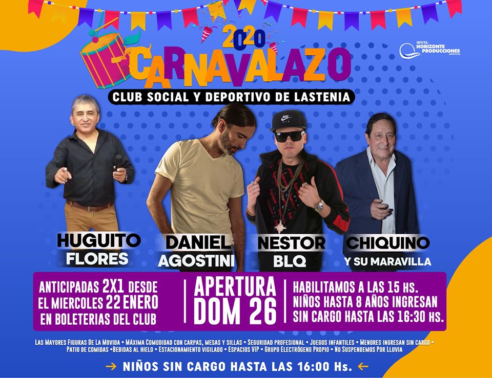 El Club Social Lastenia, presentará a partir de las 15 a Huguito Flores, Chiquino y su Maravilla, Nestor BLQ y Daniel Agostini.