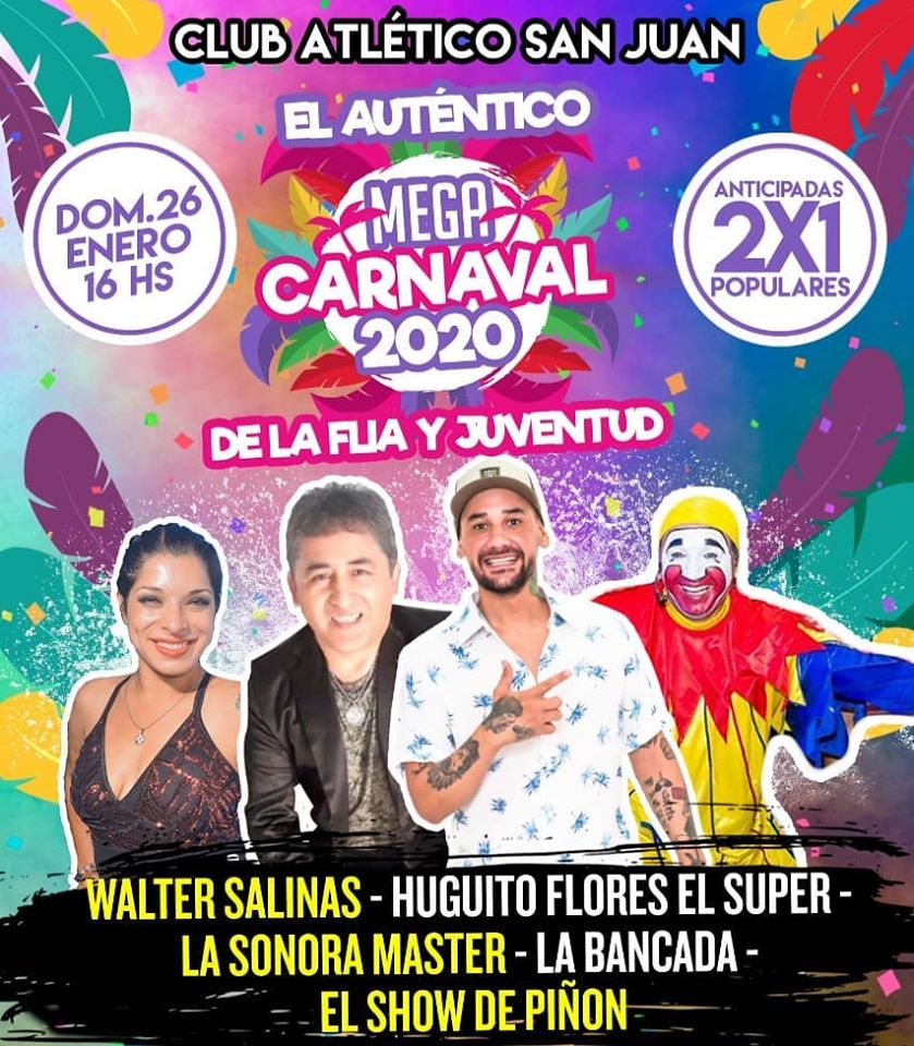 En el Club Atlético San Juan a partir de las 16, se podrá ir a disfrutar de una fiesta única con el show de Huguito Flores “El Súper”, El Sonido Master, Walter Salina, el folclore de la Bandada y el show, para los más chicos, de Piñón.