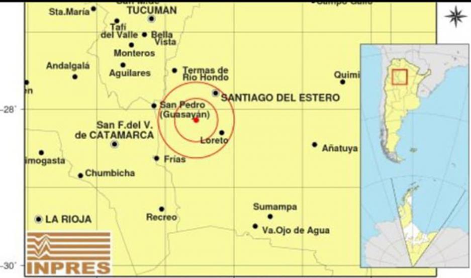 Según el Instituto Nacional de Prevención Sísmica (INPRES), el epicentro se focalizó a 48 kilómetros al SO de Santiago del Estero, a 122 de San Fernando del Valle de Catamarca y a 41 al NO de la ciudad de Loreto.