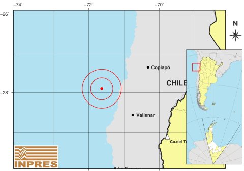 De acuerdo con los datos brindados por el Instituto Nacional de Prevención Sísmica, ocurrió a la 1.09, a más de 39 kilómetros de profundidad y tuvo sus réplicas minutos más tarde. Una de ellas de 6.2 grados a 35 kilómetros de profundidad también en el Pacífico y la otra de 5.2 pero ya en territorio chileno.