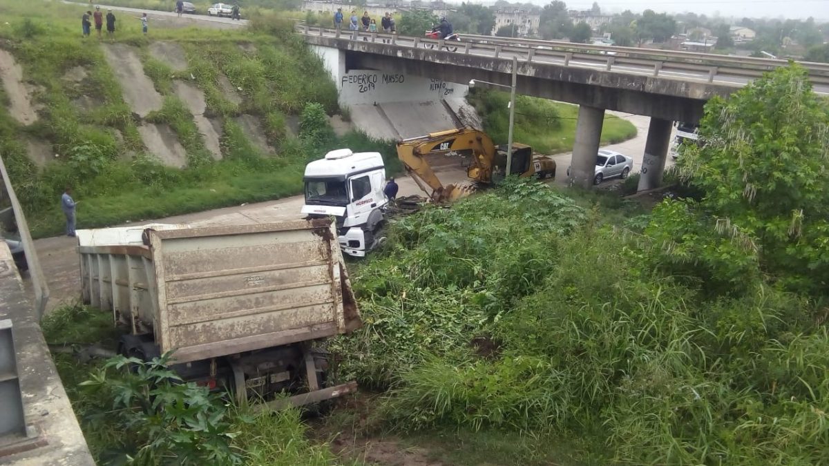 El rodado, perteneciente a la empresa constructora Hormeco, circulaba sin carga y perdió el control. Se investigan las causas. Luego de colisionar y arrancar la guarda de protección del puente se precipitó.