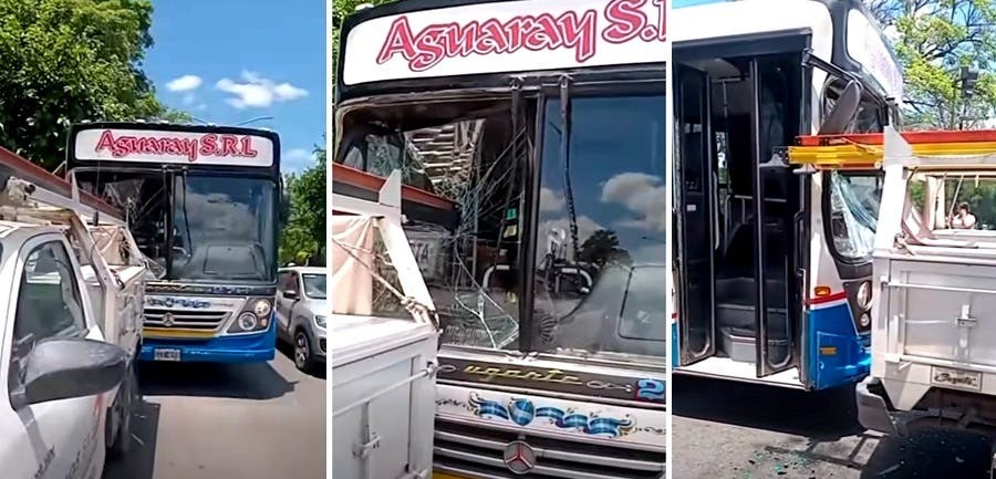 Según contaron testigos, el chofer del colectivo no logró detener la unidad y terminó colisionando de lleno contra la camioneta, que tenía una escalera en el techo. Esta estructura golpeó el parabrisas del ómnibus, provocando su rotura.
