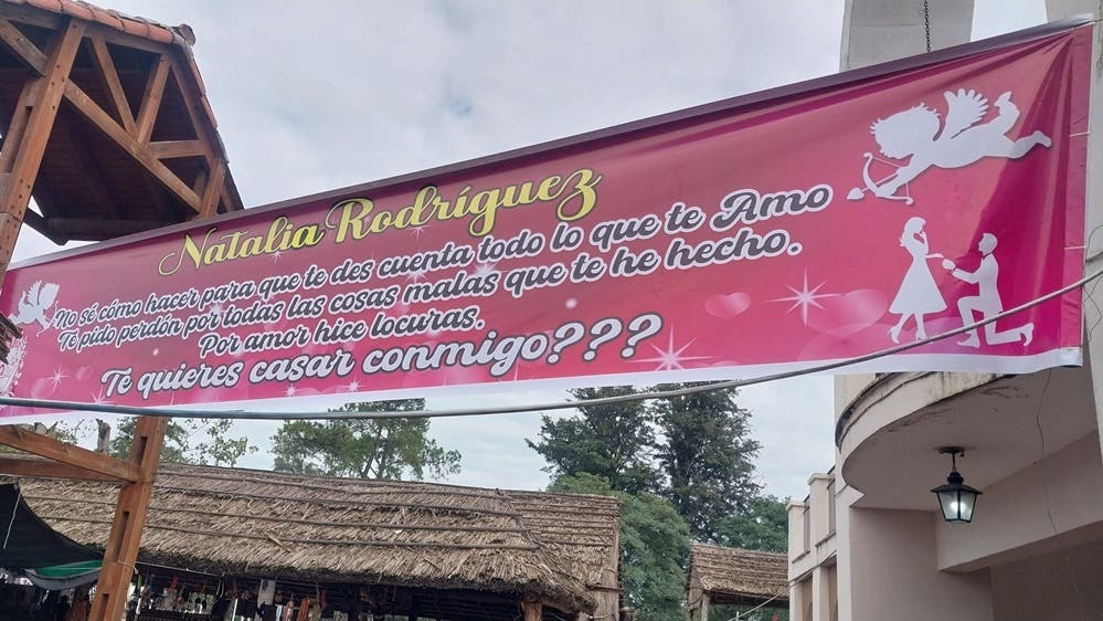 El sábado pasado, durante la tradicional Feria de Simoca en Tucumán, un misterioso cartel sorprendió y conmovió a todos los presentes: un pasacalle con una declaración de amor y una propuesta de casamiento fue colgado en uno de los accesos principales, dirigido a una mujer llamada Natalia Rodríguez. El autor del mensaje no se dio a conocer, pero su declaración pública ya se volvió viral en redes sociales.