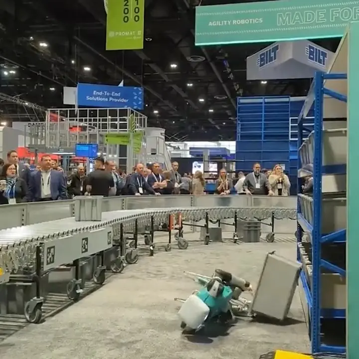 Digit, creado por la compañía Agility Robotics, se “desmayó” después de haber trabajado sin parar durante 20 horas en el almacén de la ProMat 2023 de Chicago.