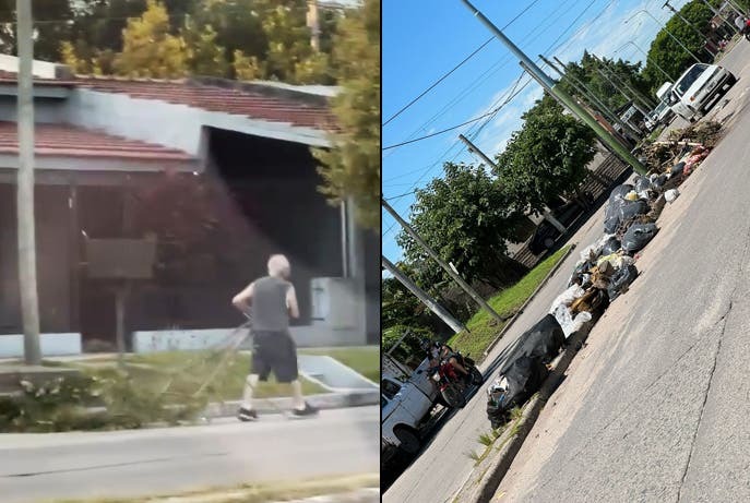 Las imágenes, capturadas por un residente de la zona, muestran al hombre saliendo de su casa con ramas de gran tamaño, arrastrándolas hasta la esquina y dejándolas en el medio de la avenida.